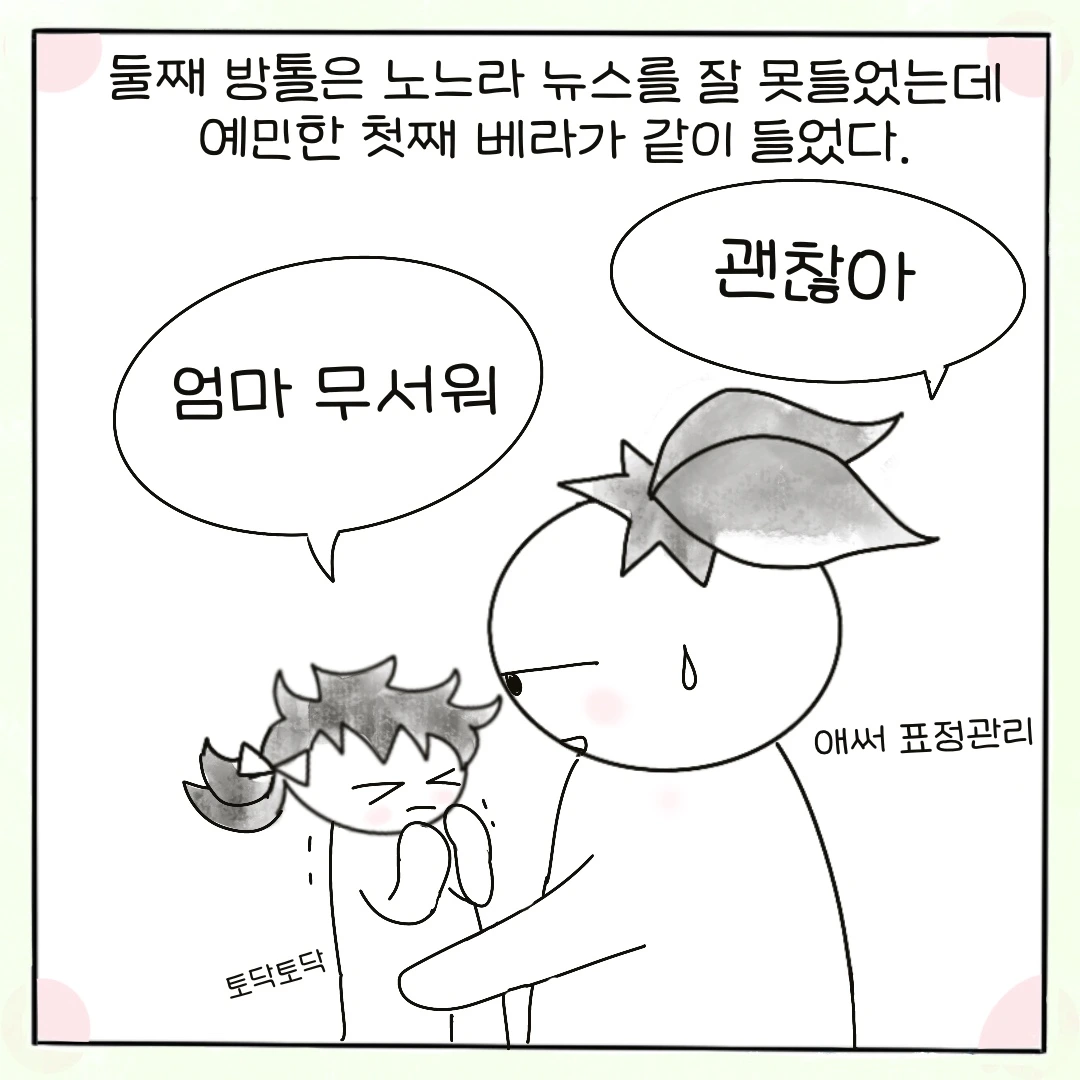 둘째 방톨은 장난감을 잔뜩 어질러 놓고 자동차 놀이를 하느라 정신이 없어서 그 뉴스를 제대로 못 들었는데.