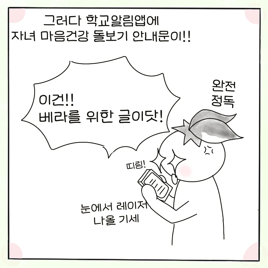 다행히 월요일 학교알림앱을 통해 '자녀 마음건강 돌보기' 안내문이 왔다. 시기적절하게 안내문을 보내준 학교에 감사하며 우리 베라를 위한 글이라는 생각을 했다. 나는 눈을 빛내며 꼼꼼하게 정독을 했다.