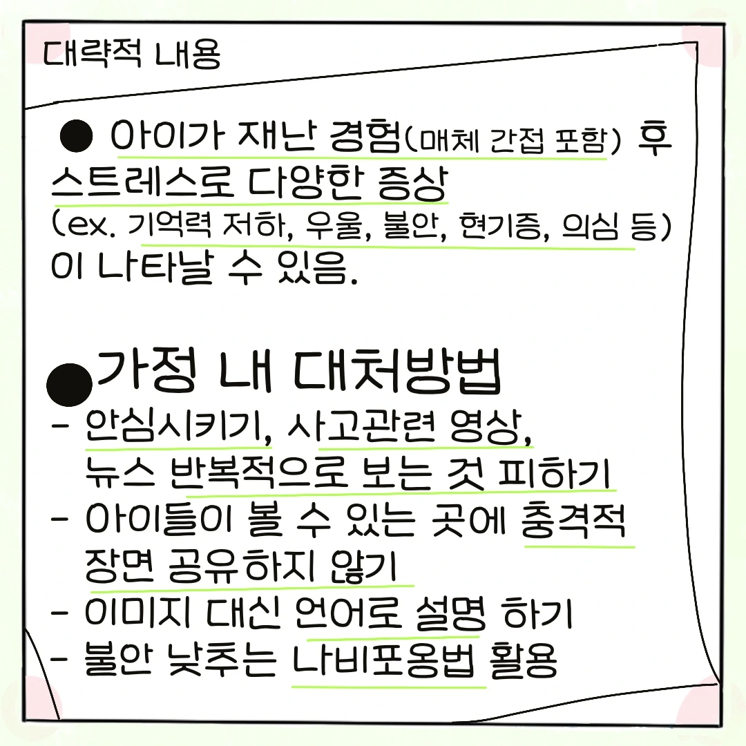 아이의 재난 경험은 직접 경험부터 매체로부터 접한 간접 경험까지 포괄한다고 한다. 그리고 그 스트레스로 기억력 저하, 우울증, 불안, 현기증, 의심 등 다양한 증상이 나타날 수 있다. 가정 내 대처방법으로 사고관련 영상 피하기, 이미지 대신 언어로 설명하기, 나비포옹법 활용하기 등이 있었다.