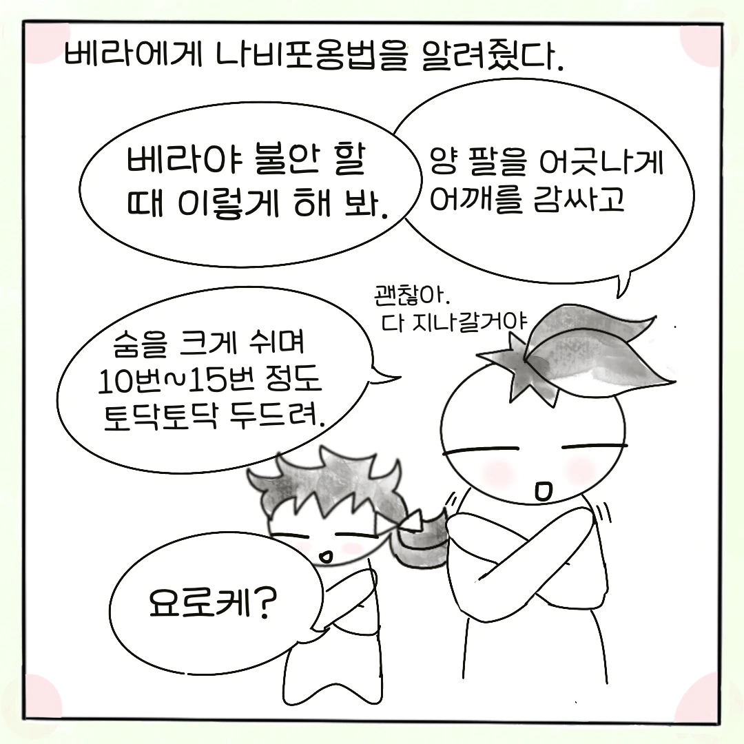 "응. 이게 나비포옹법이라는 건데. 이렇게 두드리면서 '괜찮아 다 지나갈거야' 따라 해봐."