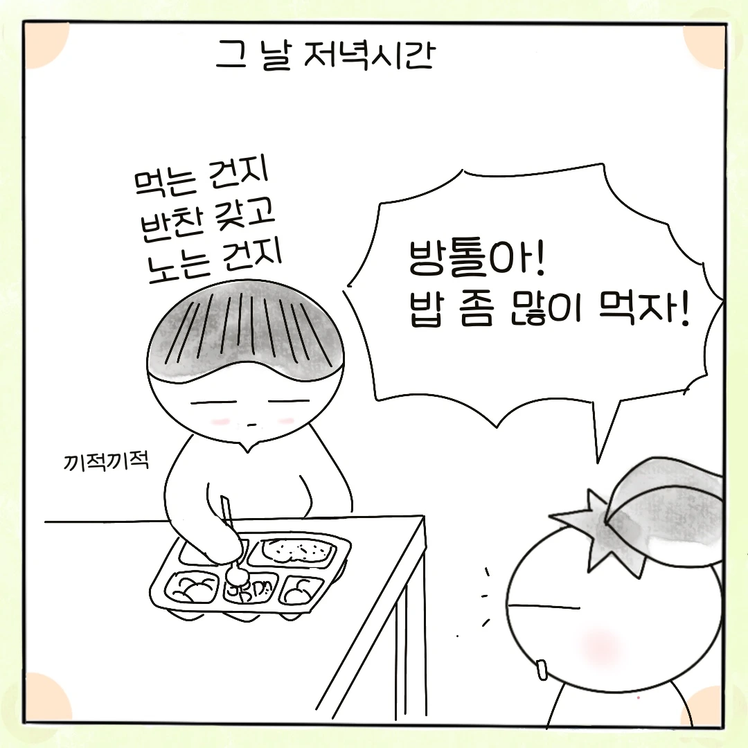 "방톨아! 장난 그만! 밥 좀 많이 먹자!"