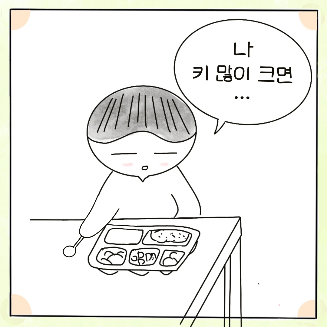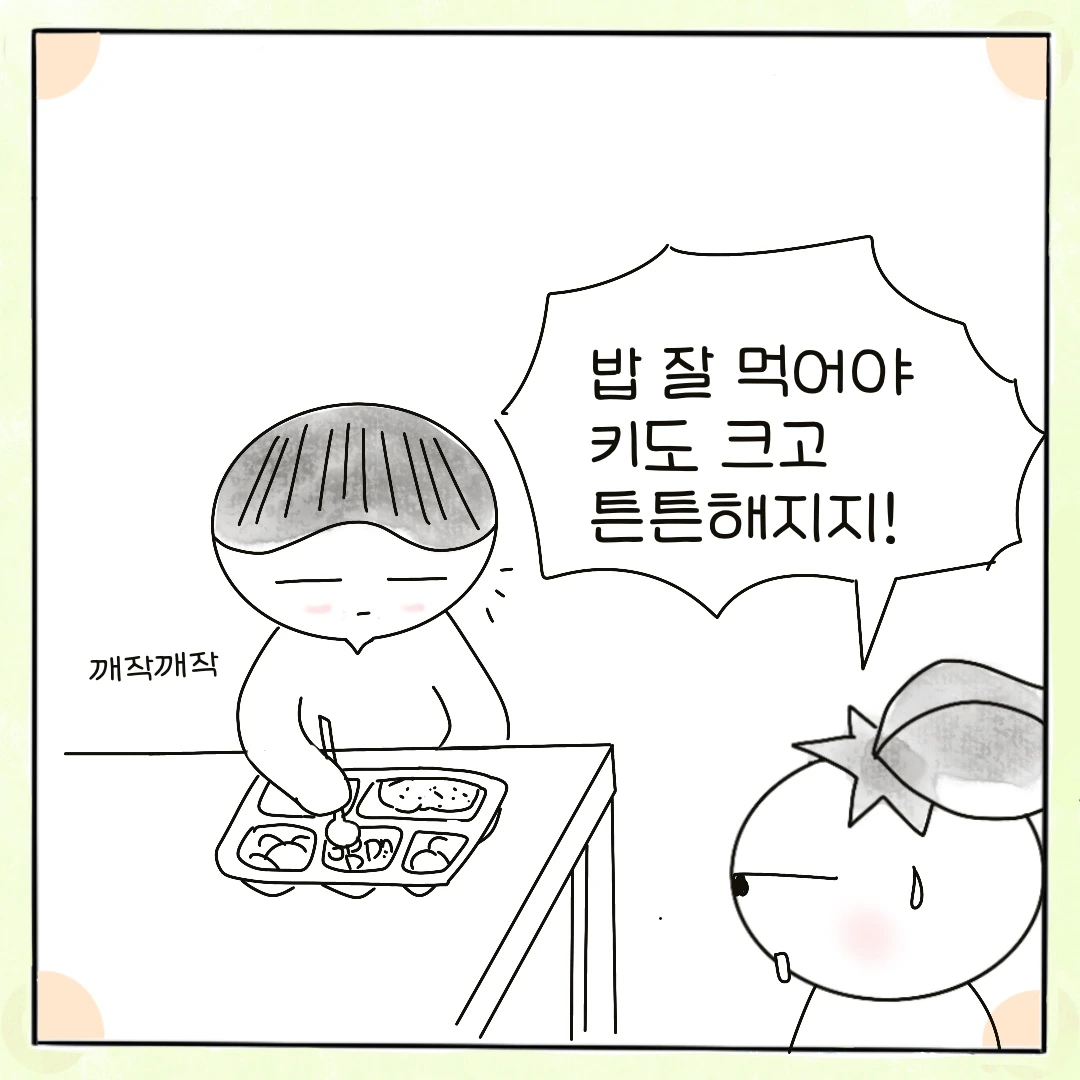 "밥 잘 먹어야 키도 크고 튼튼해지지! 오늘 유치원에서 방톨이 키랑 몸무게가 나왔는데 너무 낮게 나왔어."
