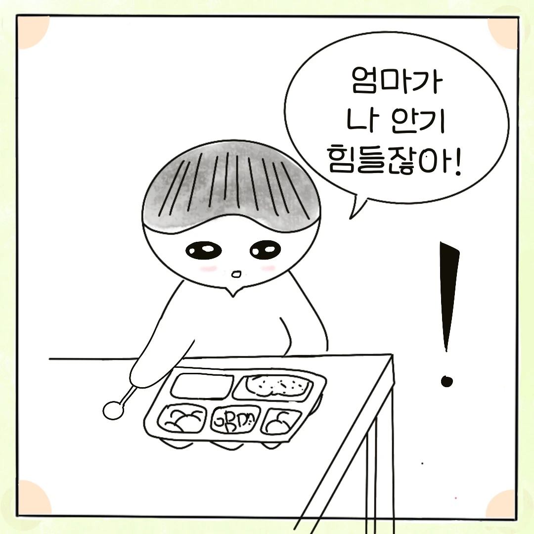 통보하듯이 말하며 식탁에서 내려가는 아들 방톨이. 식판을 보니 밥은 한 숟가락을 먹고 반찬도 자기가 좋아하는 버섯반찬만 다 먹은 상태였다.
