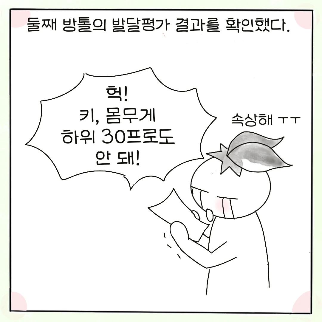 방톨은 키, 몸무게가 하위 30프로도 안 되었고 유치원 안에서 아이들 중에서는 거의 꼴찌였다.