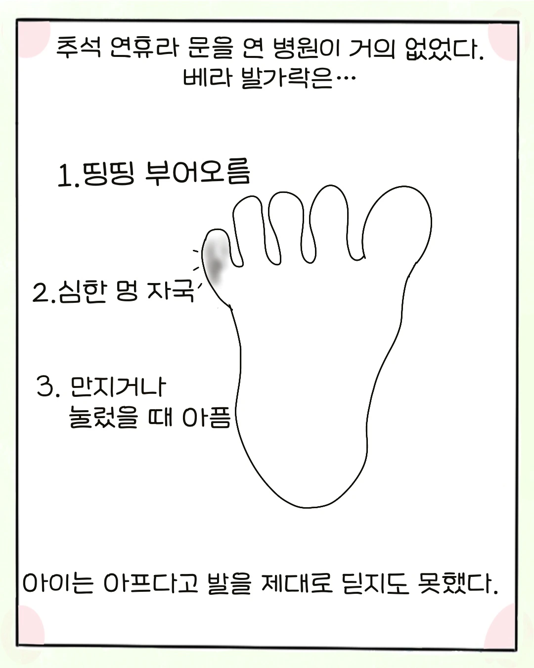 아이의 말에 발을 보니 왼쪽발의 새끼발가락이 빨갛게 부어올라 있었다. 상태를 보려고 나는 손으로 살짝 건드렸다. 아이는 아프다며 만지지도 못하게 했다.