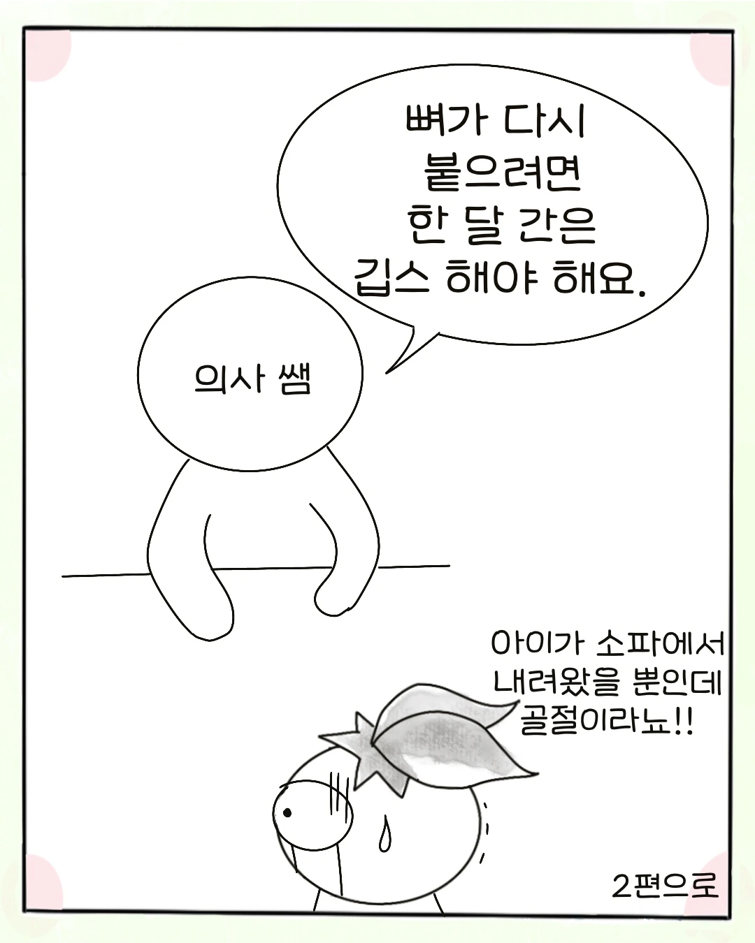 "아팠지? 끝났어. 얘야. 일단 뼈는 맞췄고 발 깁스를 할 텐데 뼈가 다시 붙으려면 한 달 정도 걸립니다."