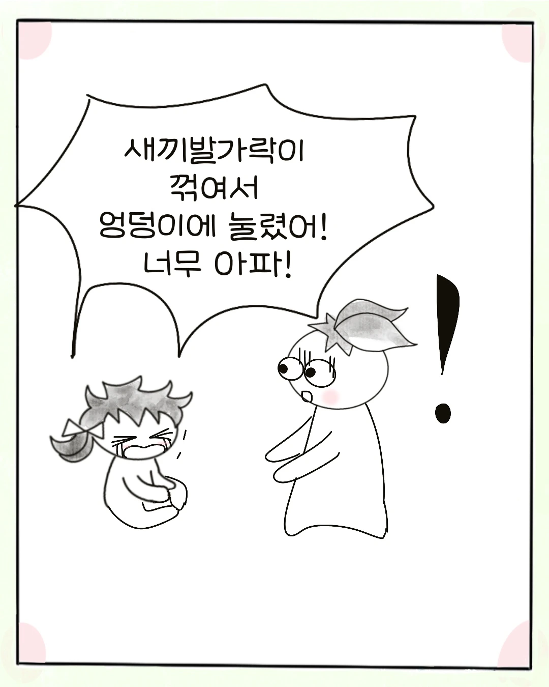 "새끼발가락이 꺾여서 엉덩이에 눌렸어! 너무 아파!"