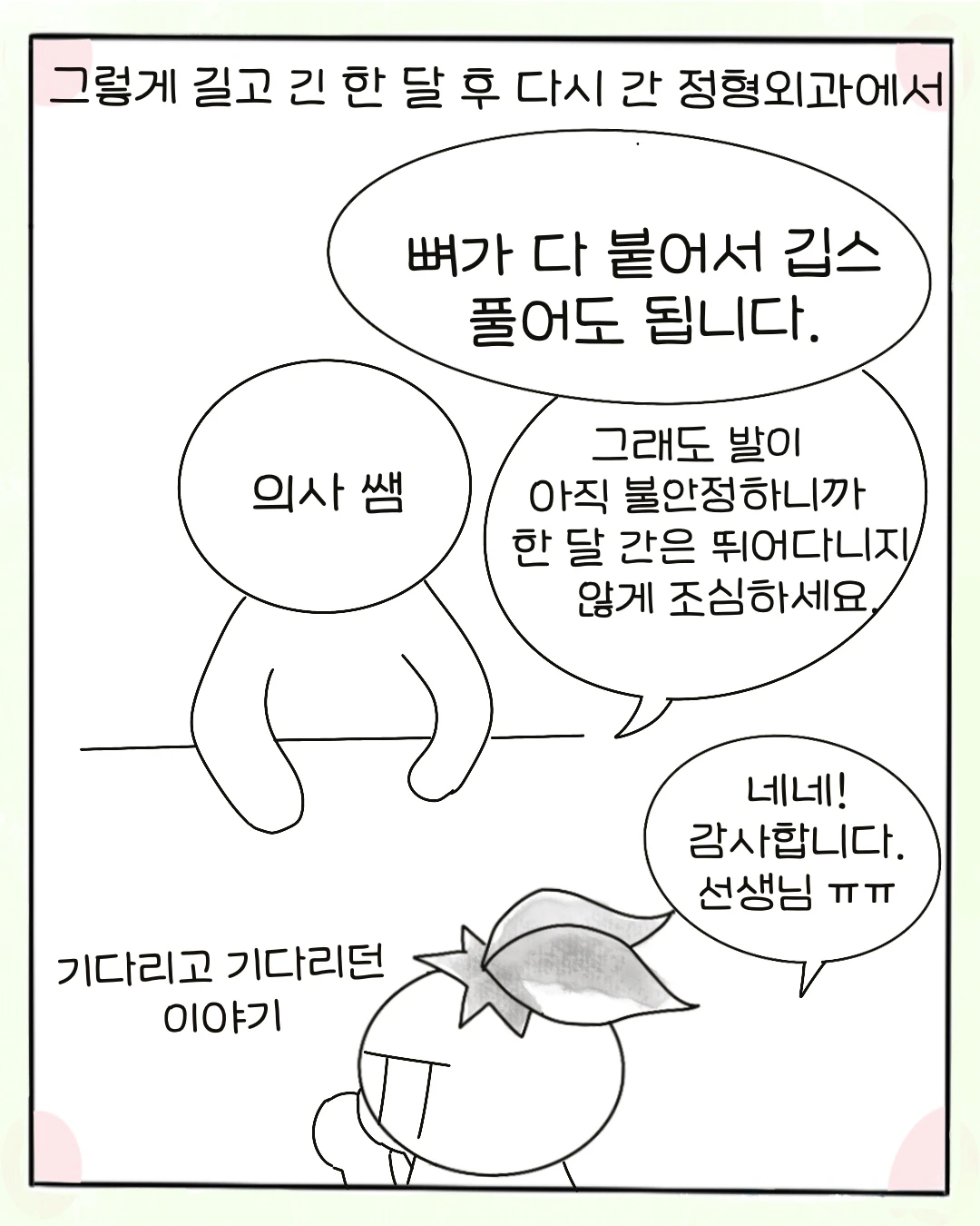 "뼈가 다 붙어서 깁스를 풀어도 되겠네요. 그래도 발이 아직 불안정하니까 한 달간은 뛰어다니지 않게 조심하세요."