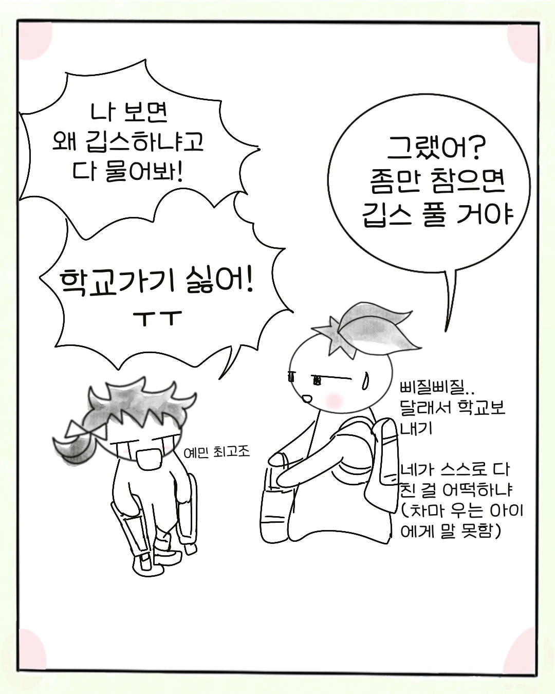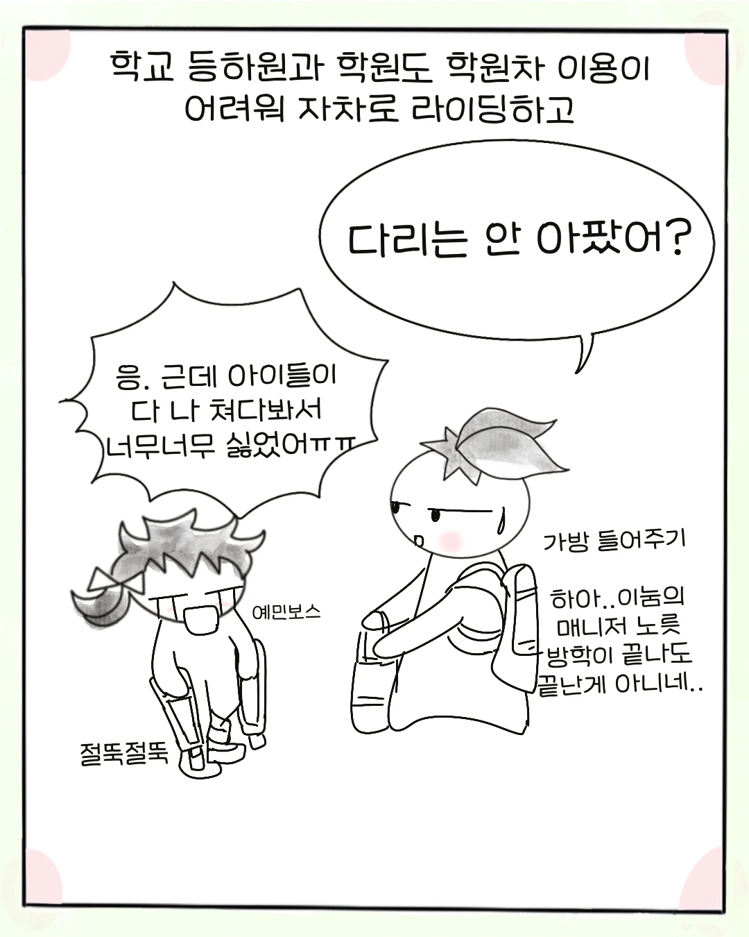 "학교에서 어땠어? 깁스하고 다녔는데 다리 안 아팠어?"