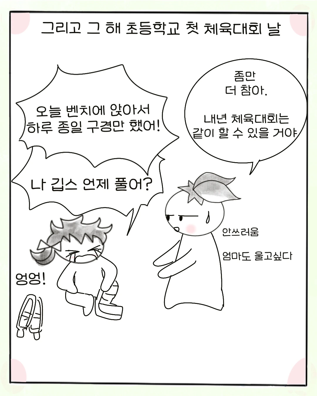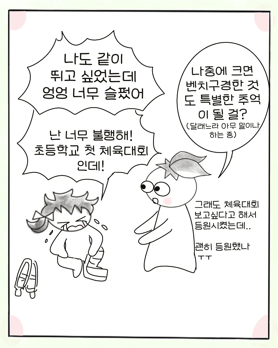 "나도 같이 뛰고 싶었는데 너무 슬펐어. 난 너무 불행해! 초등학교 첫 체육대회를 이렇게 보내다니!"