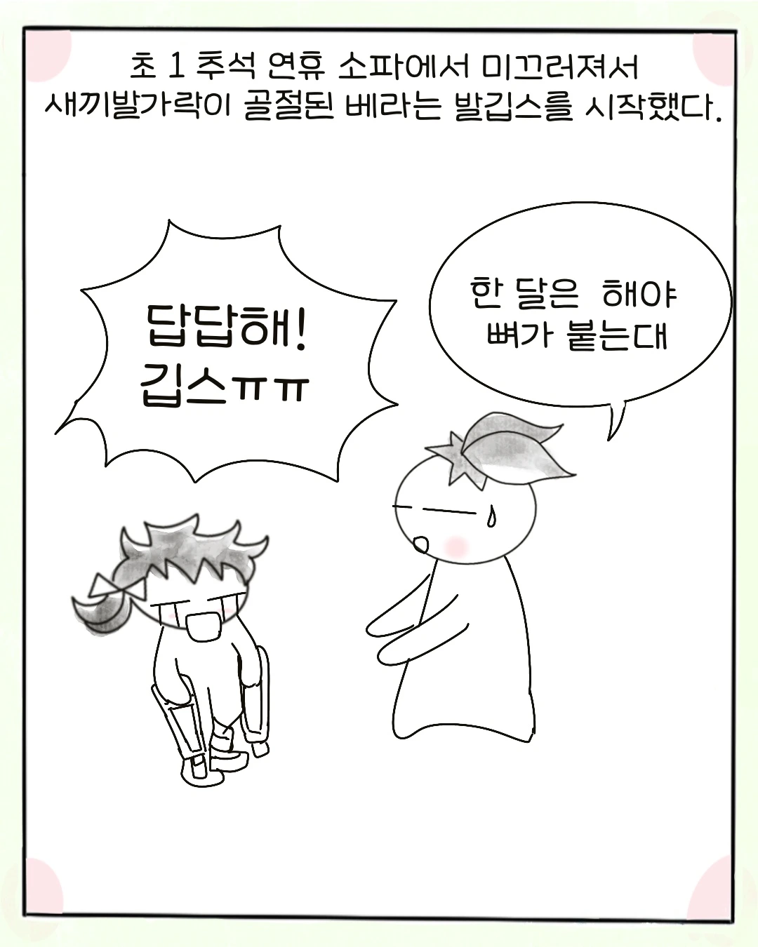 소파에서 미끄러졌다는 너무 황당한 이유로 새끼발가락이 골절된 베라는 그렇게 한 달간의 발깁스를 시작했다.