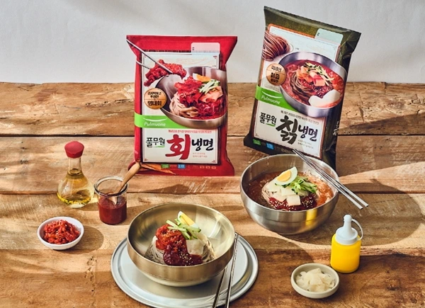 <사진=(왼쪽부터)하림-더미식 초계국수, 풀무원-회냉면과 칡냉면>
