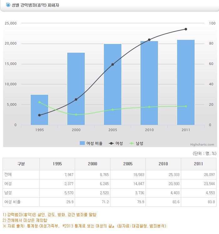 이러한 실질적 격차 외에도 우리나라의 여성은 데이트를 하다가 살해당하고, 여행을 떠났다가 살해당하고, 집으로 귀가하다가 살해당하고, 화장실을 가려다가 살해당하고 있습니다. 방법도 다양합니다. 난도질을 하기도 하고, 신체를 반으로 절단하기도 하고, 갈아버리기도 하고, 둔기로 후려치기도 하며, 주먹으로 폭행을 당해 죽기도 합니다. 이 모든 사건들이 한 해에 이 나라 곳곳에서 일어납니다. 보도가 된 2015년 1월 ~ 8월 사이의 강력범죄 통계에 따르면 피해자의 87%가 여성이라고 합니다. 7개월 동안 약 1만 3천 건의 강력범죄가 여성을 대상으로 발생했습니다. (이 범죄의 가해자는 대부분 남성입니다.)