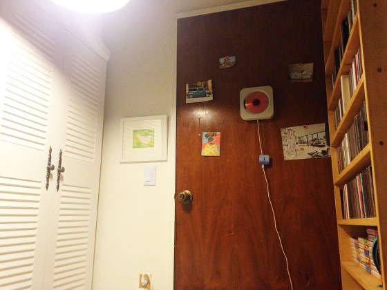 STEP 7 - 문에는 벽걸이 씨디플레이어(라디오 기능 있음)를 설치하고, 그 옆에 맞춤 씨디장을 놓았다.