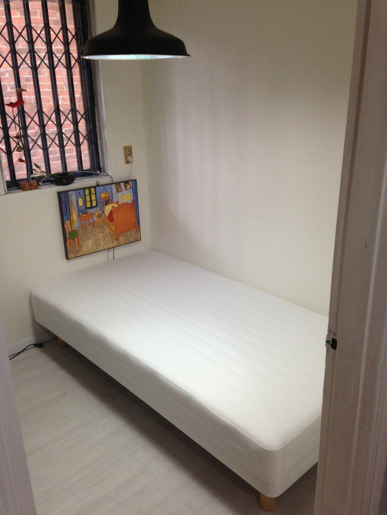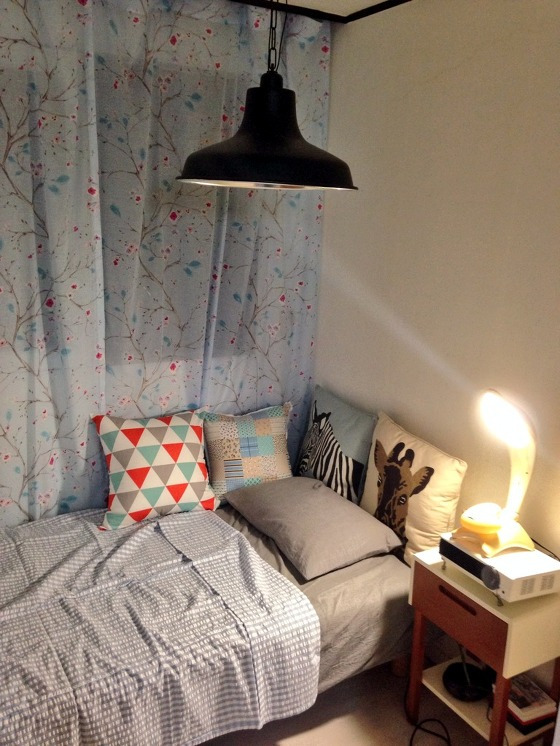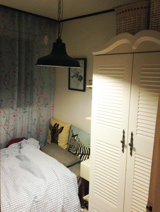 STEP 3 - 큰 맘 먹고 장만한 무인양품 스몰사이즈 일체형 침대. 조명은 검정갓 팬던트 등으로 교체.