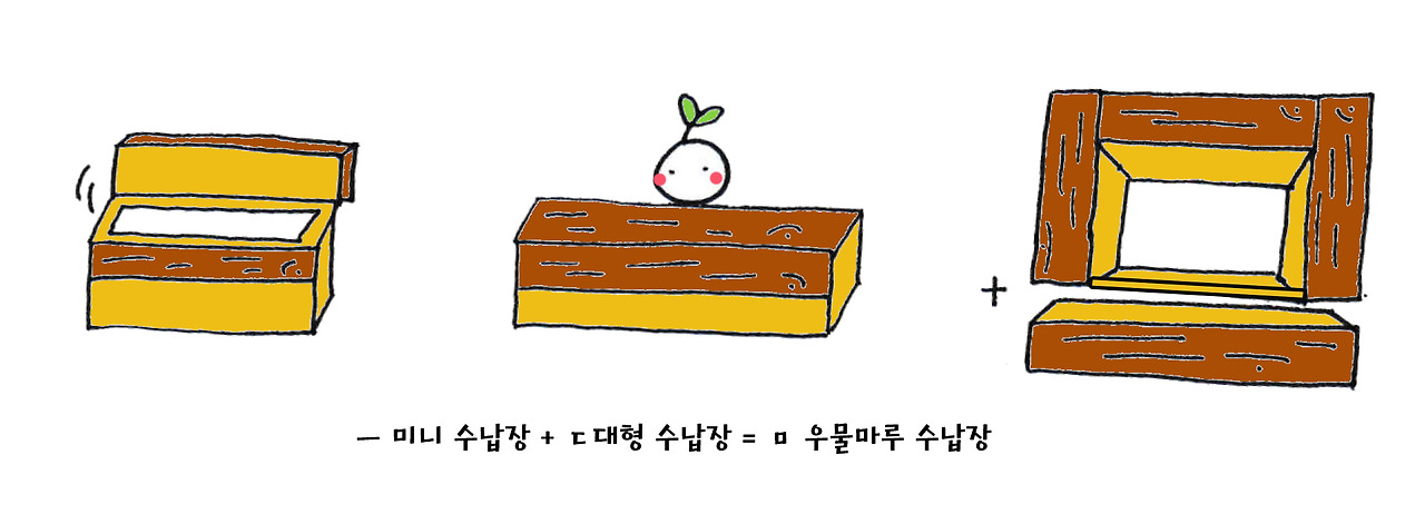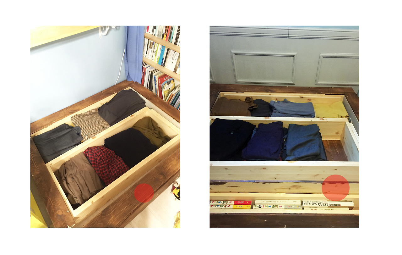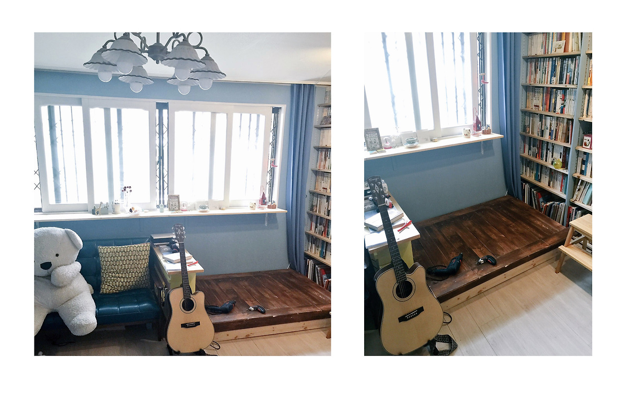 d. 어째서 고정형 마루를 ‘ㅁ’자로 다 설치하지 않고, ‘ㄷ’으로 해서 마루 앞의 ‘ㅡ’ 부분을 남겨놓았을까. 이 부분은 따로 긴 바형태의 수납장을 별도로 만들어, 간이 책장으로 활용할 수 있게 제작한 것. 이 간이 수납장을 아래와 같이 붙여놓으면 비로소 우물마루 수납장 완성!