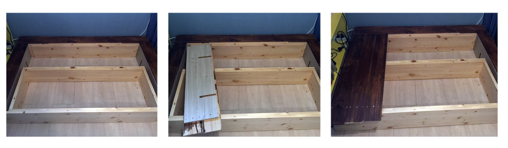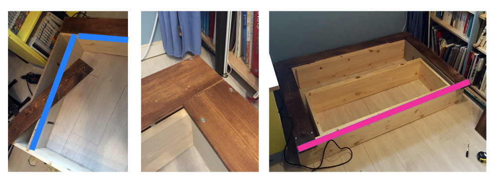 a. 먼저 경계가 되는 3면의 마루를 수납기능 없이 고정형으로 설치해야 한다. 먼저 뼈대를 만든다는 느낌으로 ‘ㅁ’ 형태로 내부용 목재를 연결해준다. 그 다음 그 둘레에 다시 ‘ㄷ’ 형태로 고정형 마루 상판을 부착할 수 있도록 조금 더 긴 목재로 외벽 뼈대를 제작. 이후 고정용 마루 상판을 올리고 나사못으로 고정.