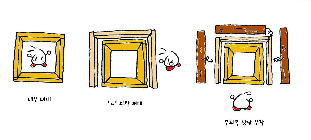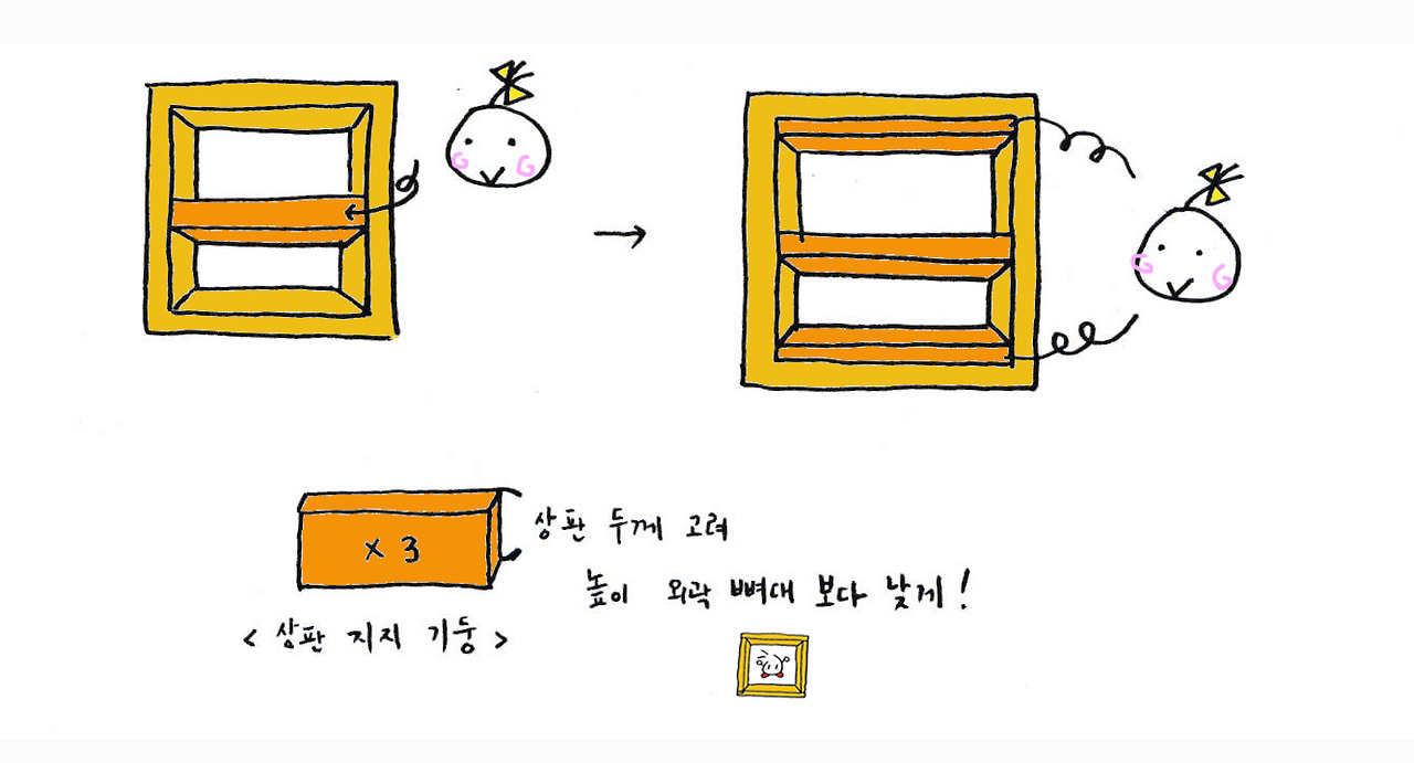 b. ’ㅁ’자 뼈대 내부에 중앙을 가로지르는 굵은 (24T이상 권장) 목재를 세우고, 기존 뼈대와 나사못으로 고정시켜준다(중앙에 가로살을 추가하면 마루가 더 탄탄해지니, 규모에 따라 가로살을 추가하면 된다). 그 후 뼈대의 위와 아래 쪽에 상판을 지지할 지지대를 각각 세우고, 역시 기존 뼈대에 고정시켜준다.