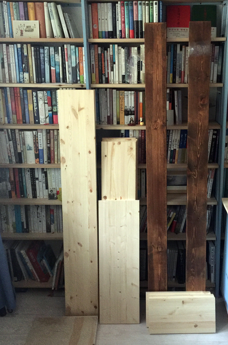 목재를 재단해서 판매하는 유명 DIY 사이트 등을 이용해 설계한 바에 알맞은 목재들을 구입. 내부에 쓰이는 목재들은 충분히 저렴한 것으로, 마루바닥이 될 상판 패널은 가격이 다소 높더라도 무늬가 아름다운 것으로 선택.