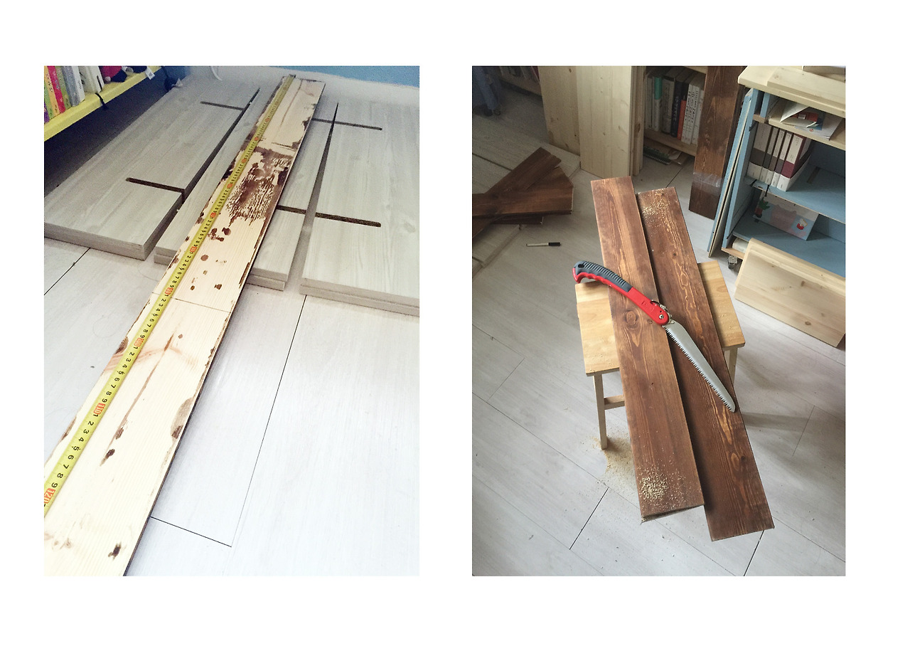 c. 기초 뼈대가 완성됐다면 이제 상판 마루를 올려보자. 반제품 무늬목 상판은 두께가 얇으므로 보완을 위해 같은 길이와 너비의 집성목 목재를 덧대어 두께를 보완(혹시 집에 남아도는 폐목재가 있다면 활용해도 좋다).