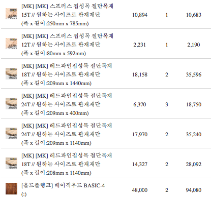 내역서 중에 스프러스와 레드파인 집성목은 해당 사이트에서 가장 저렴한 목재여서 구매, 가장 하단의 ‘베이직우드’가 상판이 될 고급 무늬목 목재다. 나뭇결과 나이테가 아름답게 살아 있다.