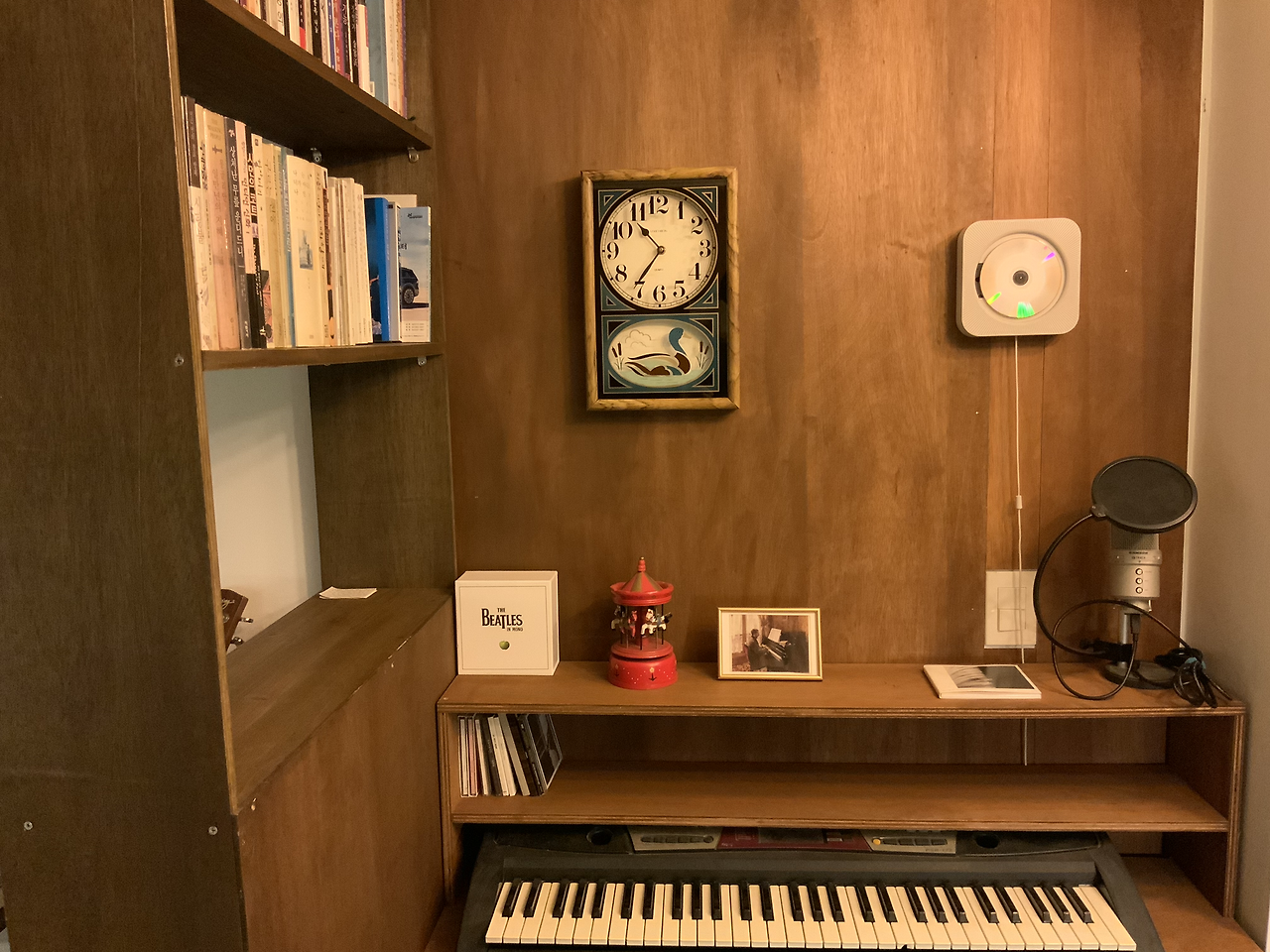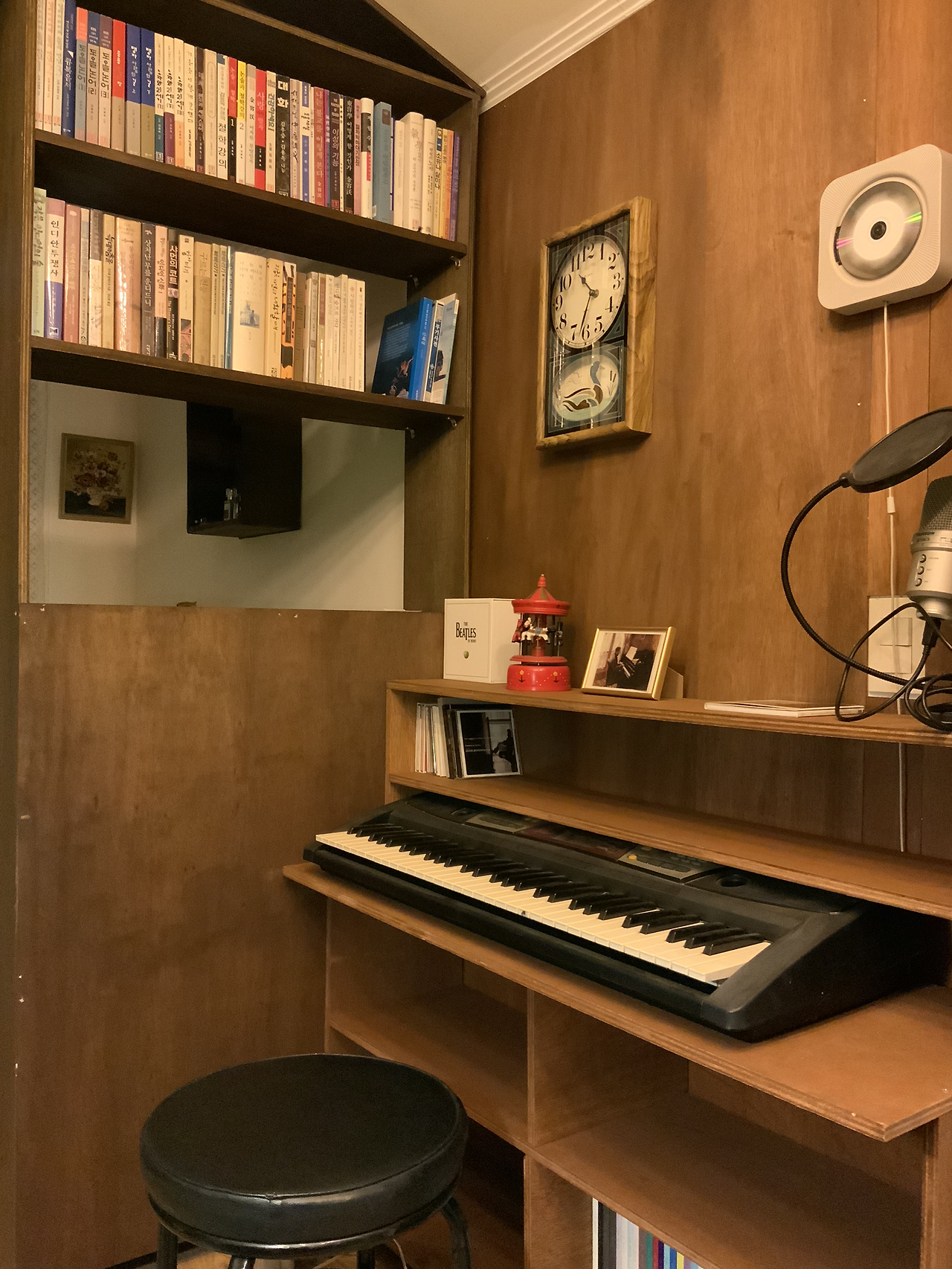 집필실에는 친구가 오래 전 선물한 전자피아노가 있는데, 지난 주말에는 그 피아노를 위한 선반을 만들었다. 나왕합판을 이용해 만든 선반으로, 피아노 건반을 올려두는 판 아래는 책을 수납할 수 있도록 했고, 판 위로는 씨디를 진열할 수 있는 기다란 수납장을 만들었다.
