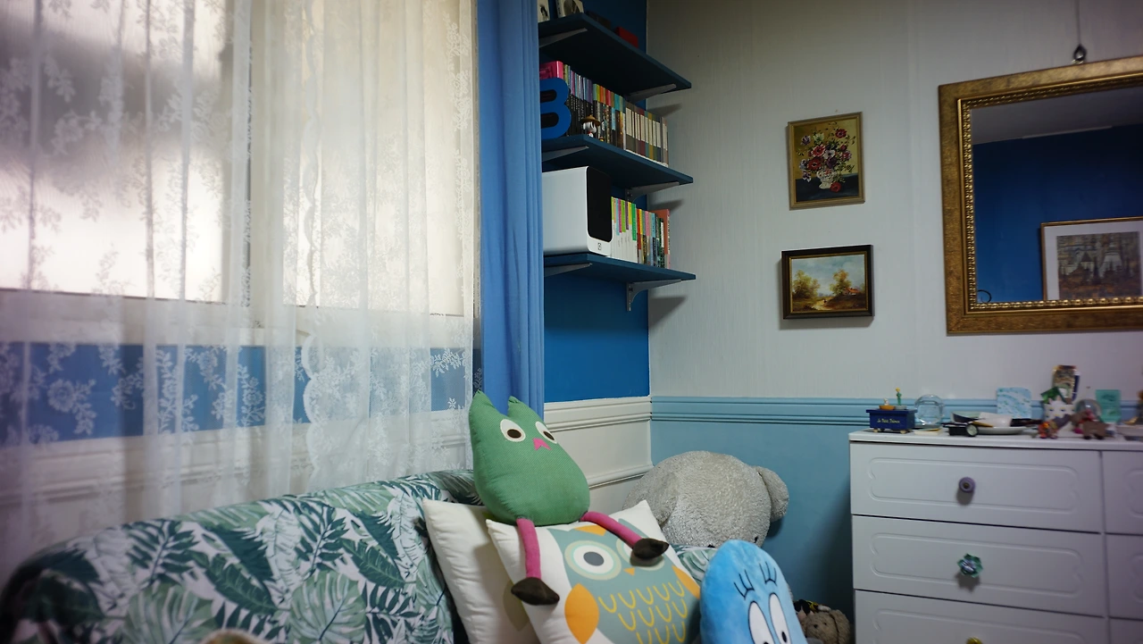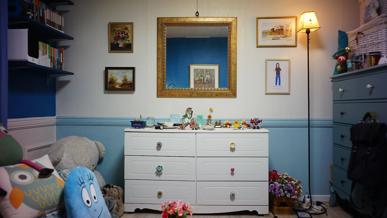 ‘안방’이라고 하면 역시 일단 거대한 퀸사이즈 침대와 벽 한 면을 가득 채우는 장롱이 필수다. 침대 앞에는 기다란 티비장이 하나 있고, 그 위에 텔레비전이 놓인다. 어디 한쪽에 가지가 많은 옷걸이와 술병 등을 진열해놓은 진열장이 있을 수도 있겠다. 뭐랄까, 거대한 가구들은 몽땅 때려넣어 집에서 가장 넓은 공간을 발 디딜 틈 없는 카오스의 공간으로 만들어버리는 게 역시 전통적인 ‘안방’의 묘미일 것이다. 덕분에 가뜩이나 여유가 없는 빌라는 더욱더 숨 돌릴 틈 없는 주거공간이 되고 마는 것은 덤이다.