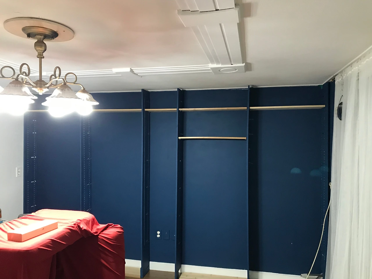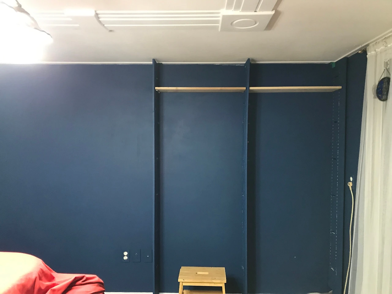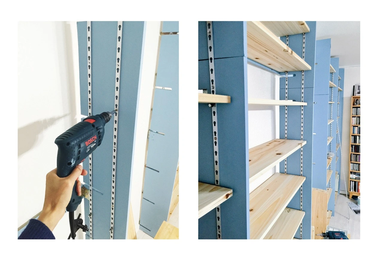 4. 책장을 설치할 벽면에 기둥을 세운다. 선반을 활용해 간격을 정확히 맞춰야 함.