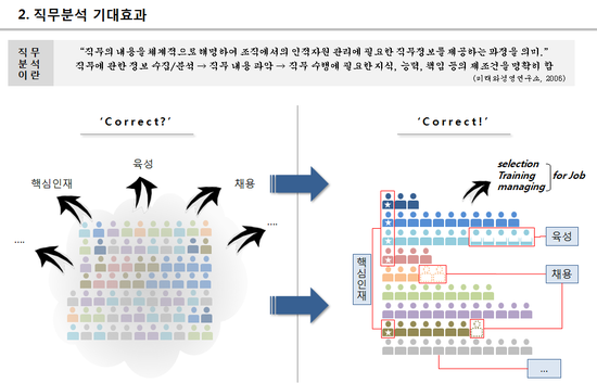 직무분석은 크게 '조사 → 분석 → 조정/정렬 → 재정의'의 과정을 거쳐야 합니다. 이미지 상에는 '조정(調整)'의 개념이 누락되어 있습니다. 조정은 그 자체로 직무분석을 하는 목적이 되기도 하고 현실에서 가장 필요한 것이기도 합니다.