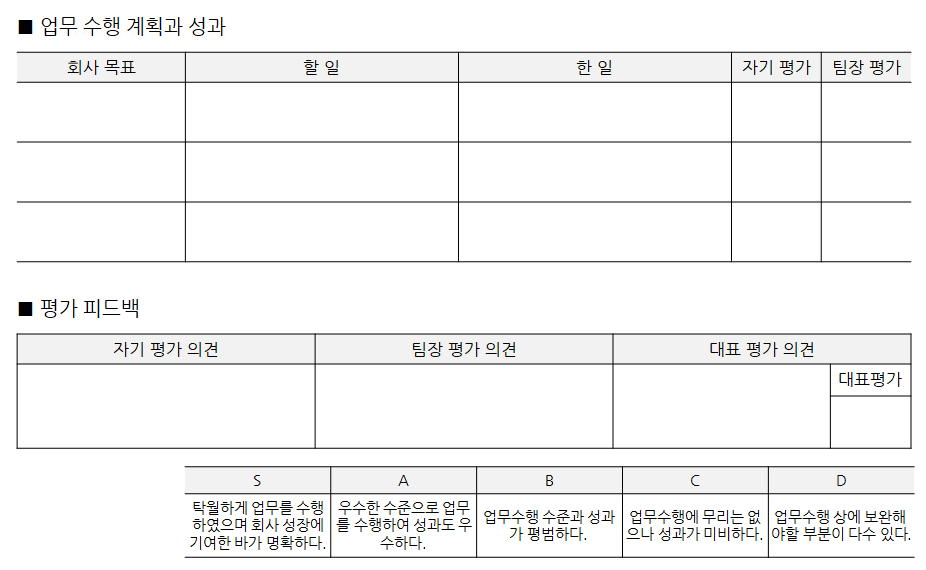 다른 회사 같은 양식을 쓸 필요도 없습니다. 우리 회사 상황(인사평가에 대한 성숙 정도)에 따라 양식을 만들면 됩니다.