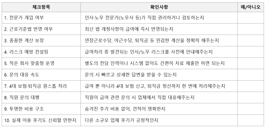 그럼, 어떤 급여대행업체를 선택해야 할까요? 작은 회사라면 특히 아래 네 가지는 꼭 확인하셔야 합니다.