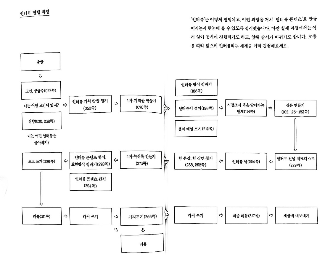 인터뷰를 보는(읽는) 일은 타인과 타인의 이야기를 보는(읽는) 일이지만, 조금 더 깊이 들어가 보면 결국 '나'에 대한 이야기로 연결됩니다. 세상에 좋은 인터뷰 콘텐츠는 정말 많은데, 그중 어떤 인터뷰가 왜 나의 마음을 움직였는지 생각하다 보면 나를 들여다보게 되거든요. 인터뷰어가 한 질문을 나에게 해보고, 나라면 어떤 질문과 어떤 대답을 했을지 상상하는 과정을 거치면 더 이상 그 인터뷰는 그들만의 것이 아닙니다. (...) 오늘의 나는 어떤 인터뷰가 좋지? 마음에 드는 인터뷰를 하고 싶다면, 이 질문이 가장 중요합니다.