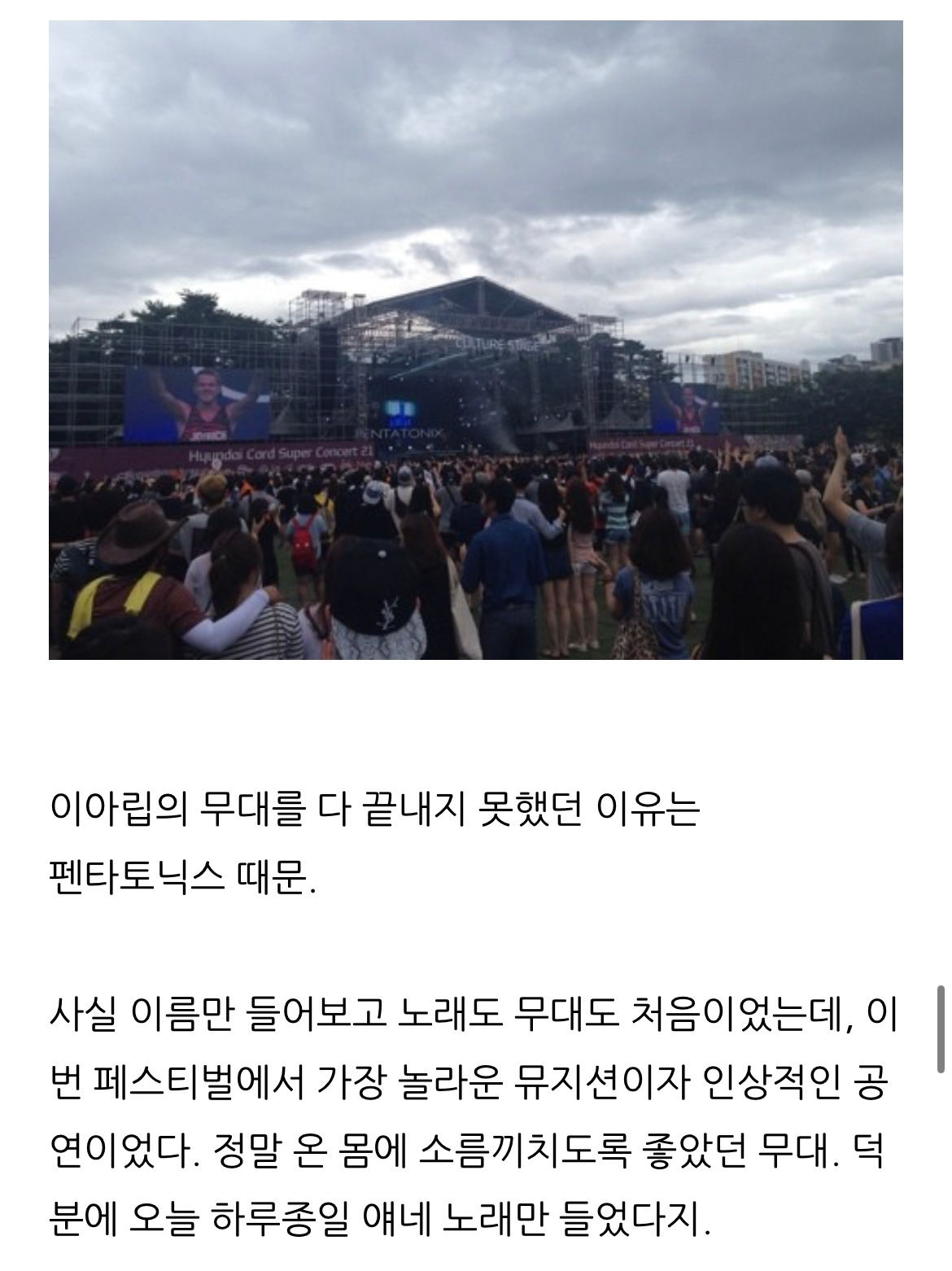 펜타토닉스를 처음 접했던 것은 2014년 현대카드 시티브레이크에서였는데, 공연을 보고 당시에 얼마나 좋았던지 이렇게 글을 남겼었다.