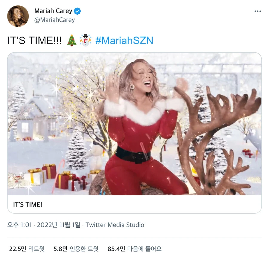 바야흐로 크리스마스 시즌. ‘It’s time’이라는 말이 딱이다. ‘All I Want for Christmas Is You’를 들어야 할 때라는 그런 말. 크리스마스가 아니라도 겨울이라는 계절을 상징하는 곡이자 (빌보드 핫 100 1위를 19곡이나 보유한) 머라이어 캐리의 대표곡이다. 90년대에는 그러니까 머라이어 캐리의 전성기에는 ‘All I Want for Christmas Is You’가 머라이어 캐리의 유명세를 따라가는 모양새였는데, 시간이 흐르고 흘러 이제는 노래가 머라이어 캐리를 더 유명하게 만들어주는 중이다.