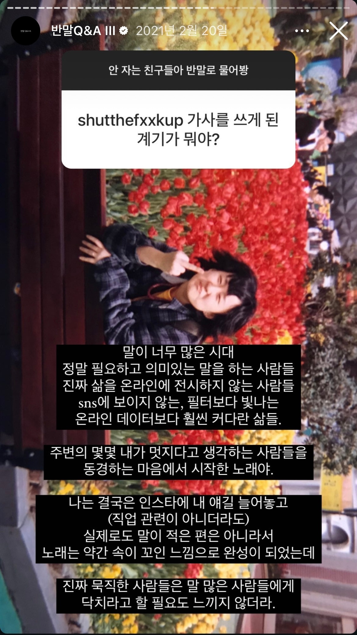 앨범 속 많은 곡들이 정말 좋지만 원픽은 6번 트랙 ‘SHUTTHEFXXKUP’. 선우정아 본인이 언급한 것처럼 언어의 홍수 시대 말이 많은 사람들에게 한방 날리는 곡으로, 대놓고 말하는터라 욕이 욕처럼 느껴지지 않는 너무나 유쾌한 곡이다. 5번 트랙 ‘욕의 여행’과 함께 이어듣는 것을 추천!