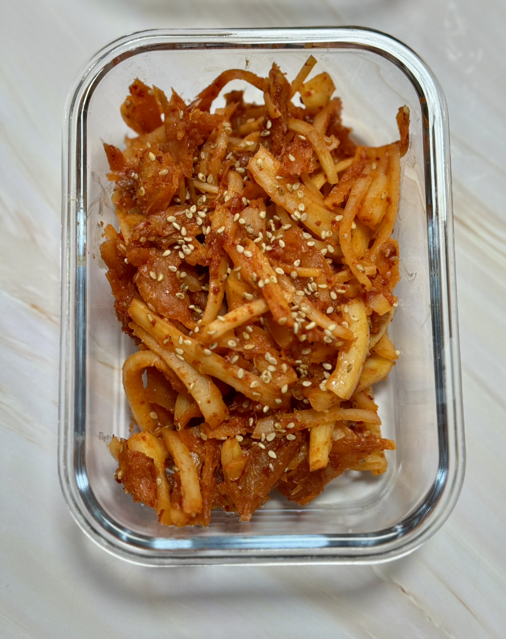 집에 사뒀던 초고추장이 있어서 그대로 사용했어요. 초고추장 3수저 넣고, 매실액 1수저, 다진마늘 넣고 조물조물 해주세요. 양에 따라 양념은 가감해주시면 됩니다. 그리고 마지막에 참기름 쪼록!