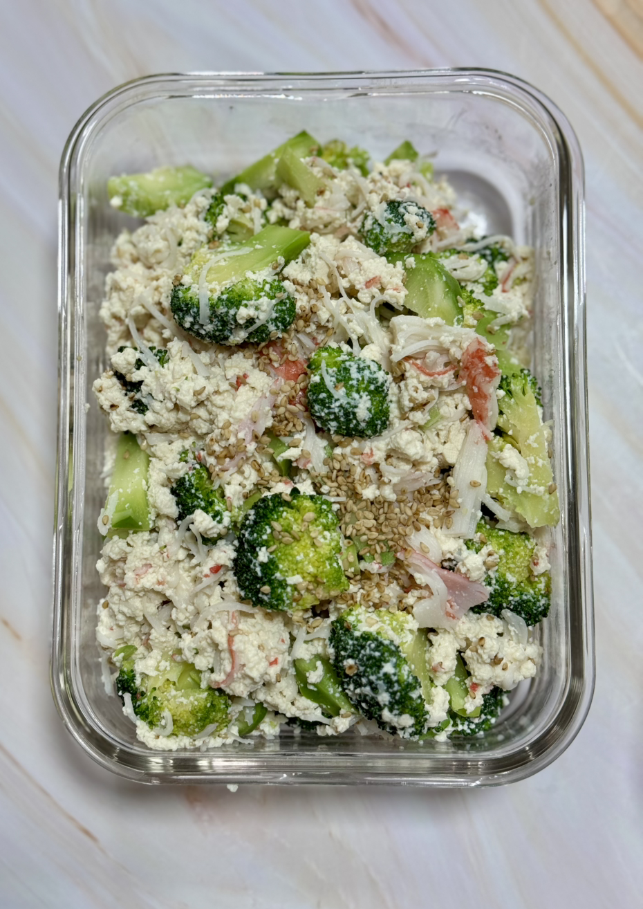 키친 타올에 감싸뒀던 두부를 꺼내서 포크로 으깨주고 크래미도 5개 찢어주세요. 너무 잘게 찢으면 맛이 안느껴지니 손으로 두께감 있게 넣어주세요. 브로콜리도 넣고 맛소금 반수저 정도 넣고 조물조물 해주세요.