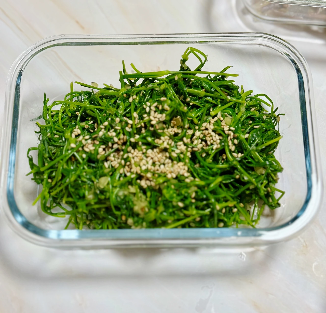 양념 준비물: 굵은소금 1수저 (데치기용), 다진 마늘 1수저, 간장 1/2수저, 참치액 1수저, 매실액 1/2 수저, 참기름, 통깨