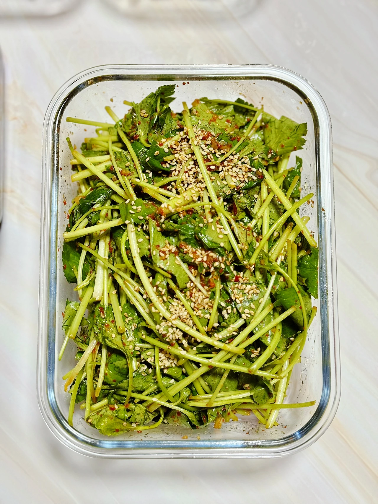 데친걸 사서 손질할건 따로 없었고 그냥 찬물에 2~3번 씻어줍니다. 씻은 후 한입 크기로 썰어두고 물기를 살짝 짜내줍니다.