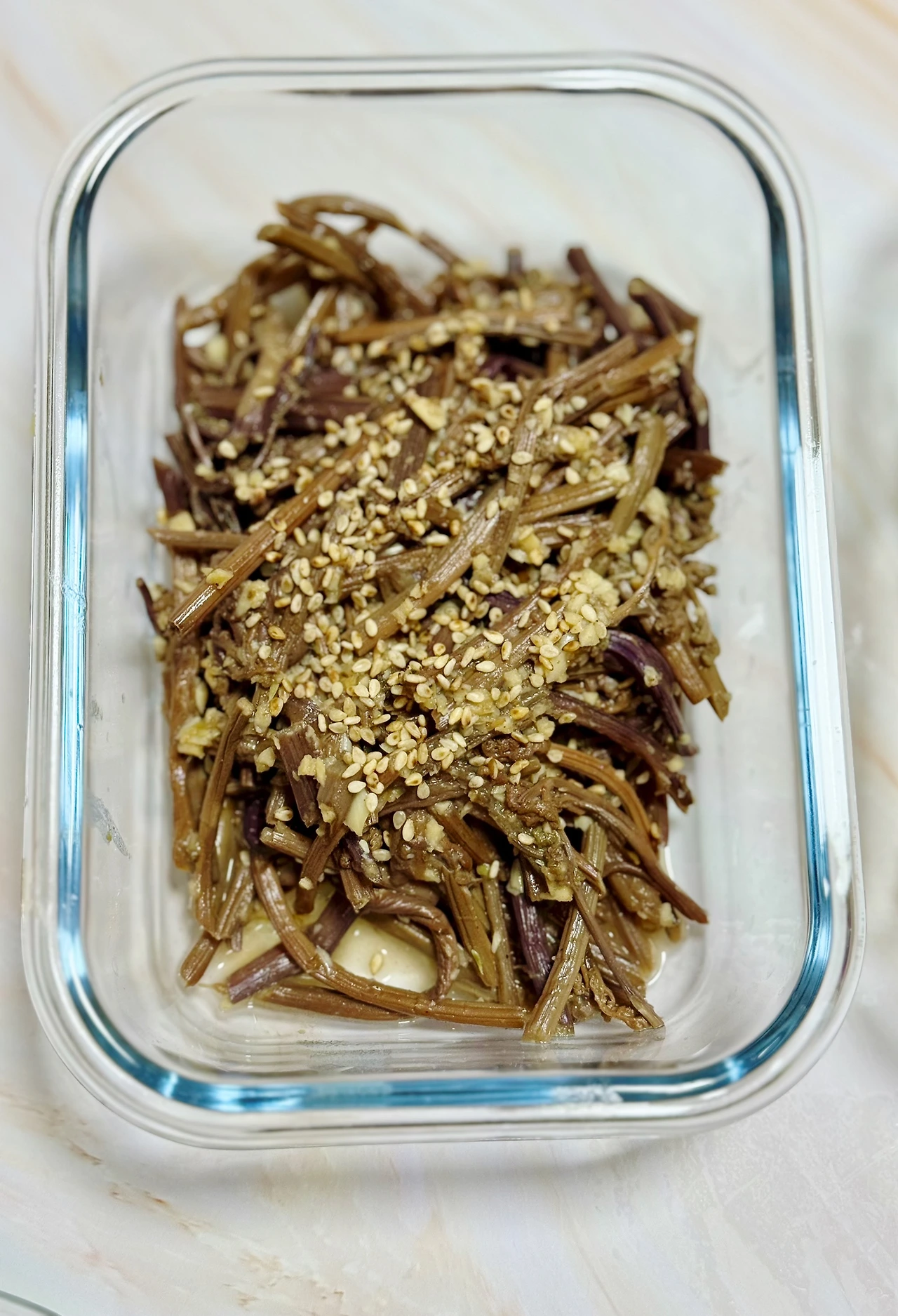 다진 마늘 1수저, 간장 1/2수저, 참치액 1수저, 매실액 1/2 수저 넣어주세요. 나물양에 따라 양념 양이 달라지니 간장은 조금씩 넣어서 간 보고 맞춰주세요.
