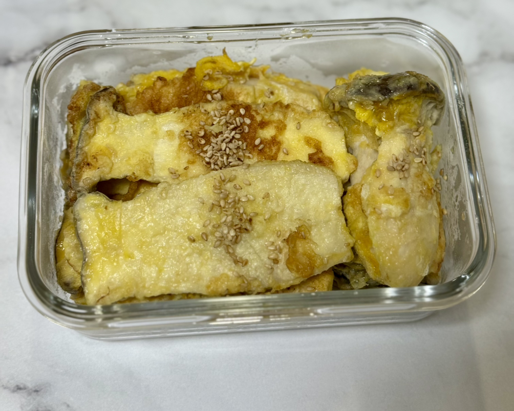 - 계란 2개는 조금 부족했고 3개는 조금 남았어요. 계란물 잘 풀어서 맛소금 살짝 넣어주세요. 그리고 새송이 버섯 앞뒤로 잘 묻혀주세요. 기름 두른 프라이팬에 맛잇게 부쳐줍니다.