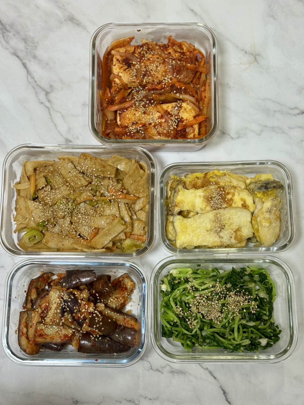 저번주 밑반찬은 매콤짭짤하게 조린 두부조림과 어묵볶음, 냉장고에 너무 많아서 해본 새송이전과 가지나물무침, 유채나물 무침 다섯가지 입니다.