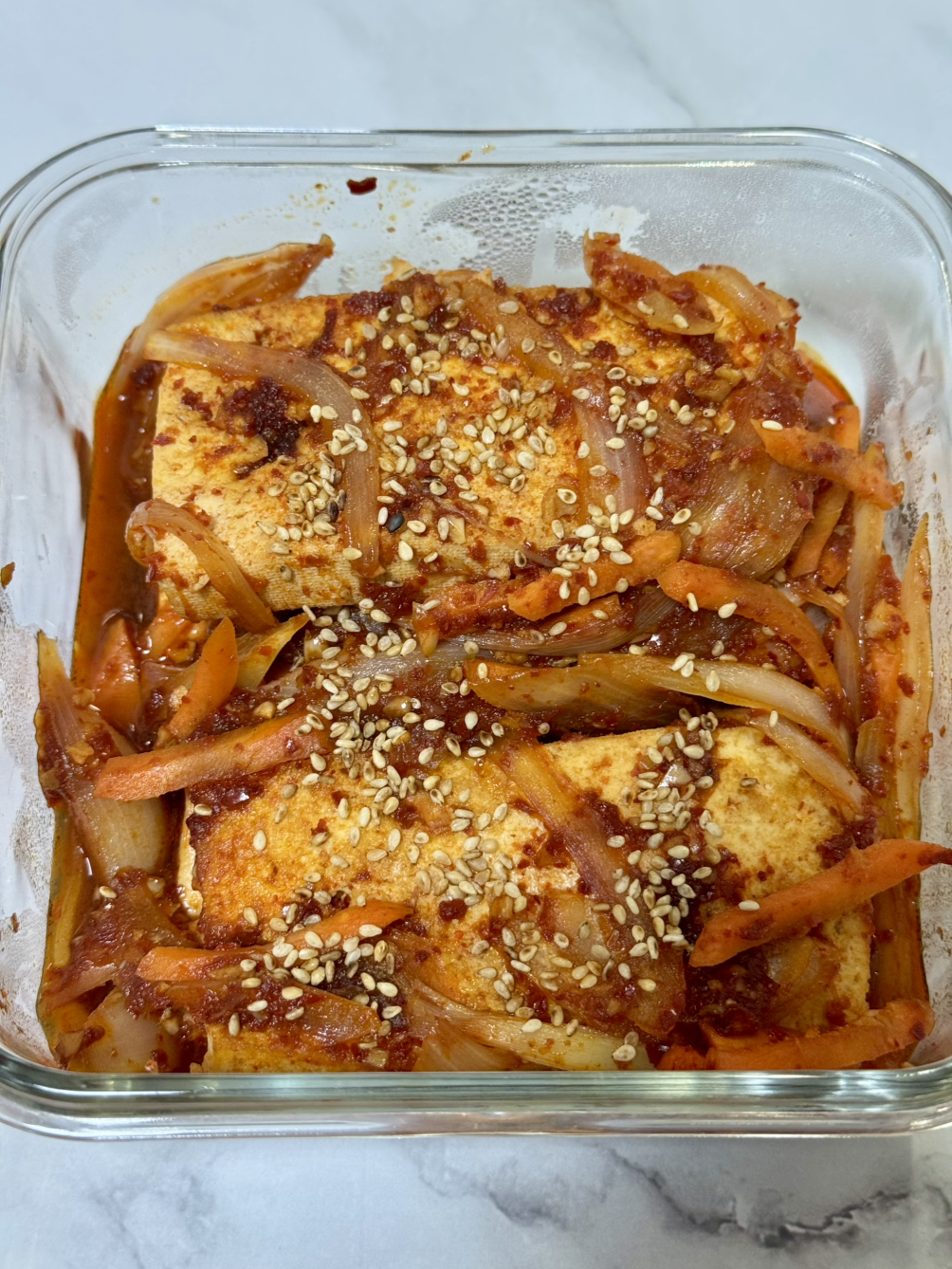 - 두부 부치던 프라이팬에 그대로 두부 위에 양념장을 골고루 발라주세요. 그리고 당근과 양파를 올려주세요.