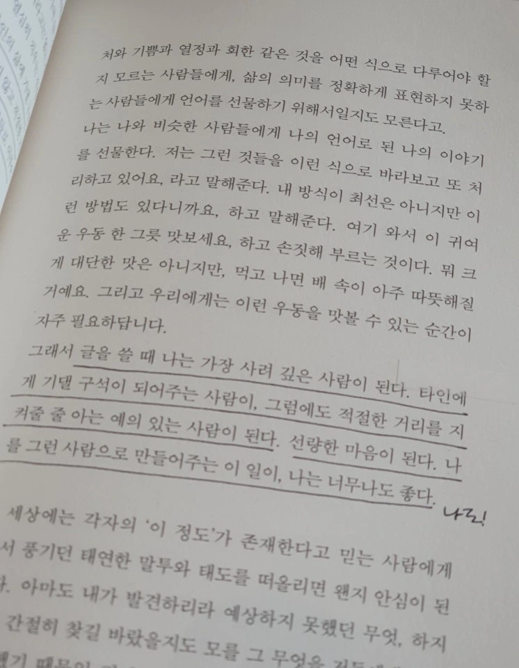 우리가 일상을 정성 들여, 바르게 살아간다고 해서 이 세상이 달라지지는 않을 것이다. 하지만 세상은 개인의 노력만으로는 달라질 수 없는 곳이기에, 거꾸로 우리가 할 수 있는 것 역시 이 일상을 정성 들여, 올바르게 살아가는 것부터라는 생각이 든다. 그것은 외부 세계에 눈을 감거나 귀를 막고 자신만의 성을 높이 쌓아 올리는 것과는 다른 일이다. 그건 어쩌면 사막에 풀씨를 뿌리거나 나무를 심는 일이나 마찬가지일지도 모른다. 아무 소용도 없고 결실을 맺게 될지 아닐지 모를 일. 그런다고 세상이 털끝 하나 달라질 것 같으냐는 소리 나 듣기 딱 좋은 일. 하지만 의미가 없을지도 모르는 세상에서도 의미를 찾기 위해 노력하는 자세, 나는 그런 것이 좋다. 언제나 그런 사람들을 응원하고 싶고, 그런 사람들의 이야기를 읽고 싶다.