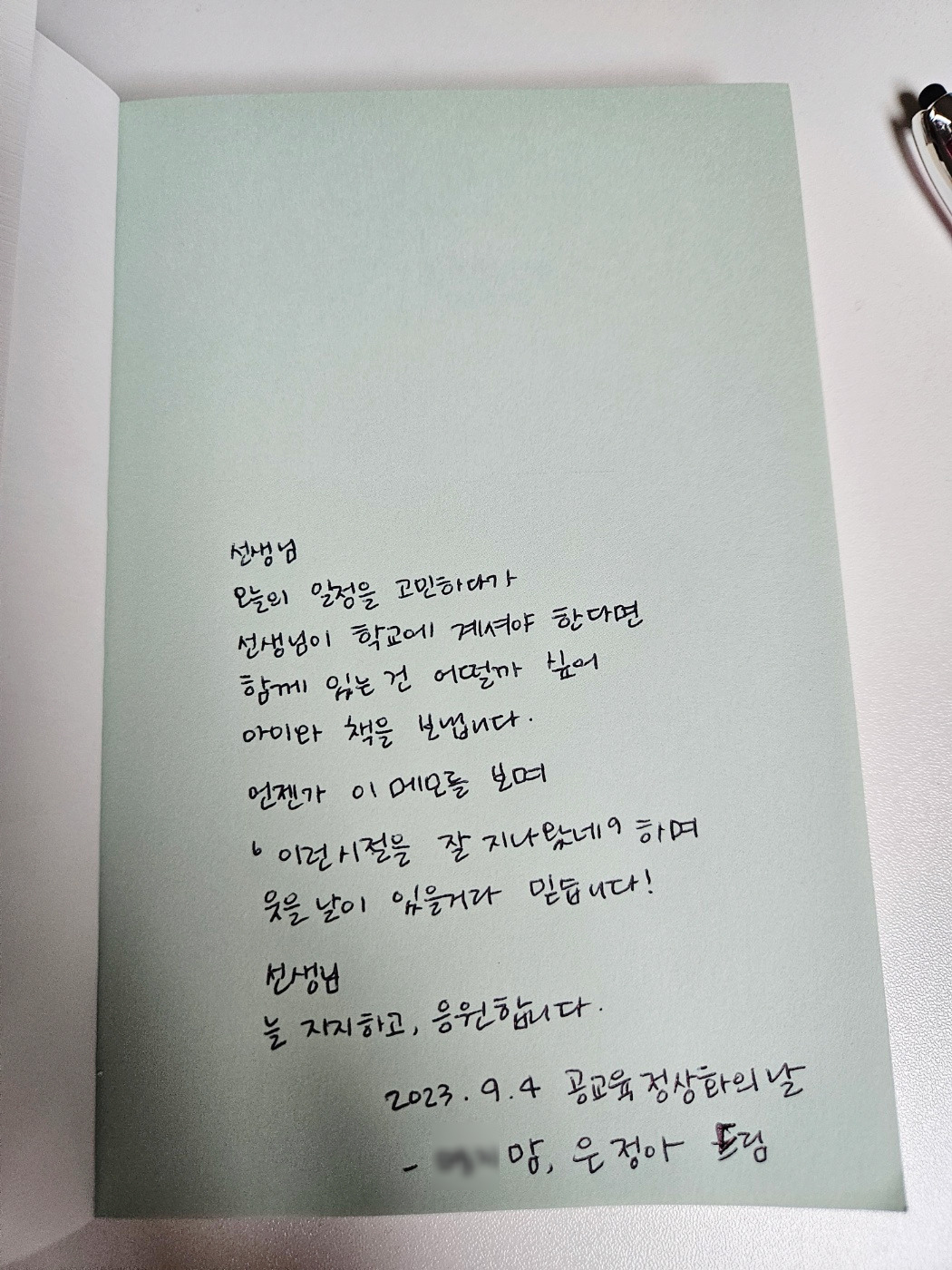일요일 저녁, 내일 어떻게 까 고민을 했다. 사실 진작 체험학습을 내야 했는데, 안일했다. 아이가 급식이 집밥보다 맛있다고 학교 빠지는 걸 싫어하는 게 컸다(사실 나도 학교 보내고 싶고... 허허허). 그러나 분위기가 심상치 않았다. 만약 어쩔 수 없이 선생님이 학교에 계셔야 한다면, 아이가 있는 게 낫지 않을까 싶었다. 대신, 모른 척하고 싶진 않았다. 마음을 표현하고 싶었다. 편지는 너무 길고(그렇게 할 말이 있진 않...), 엽서만 덜렁 보내긴 좀 그래서 고민하다, 내 책을 드리기로 했다. 비록 나온 지 오래됐으나... 허허허. 드리는 명분이 있으니.