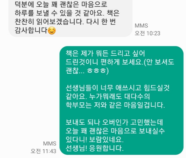 그러나 다행히도 잘 전달됐고, 선생님에게 정성스러운 답장도 왔다. "덕분에 꽤 괜찮은 마음으로 하루를 보낼 수 있을 것 같다"라고. 아, 고마워라. 혹시 누가 될까, 선생님의 문자 일부와 내 답장만 공개한다.