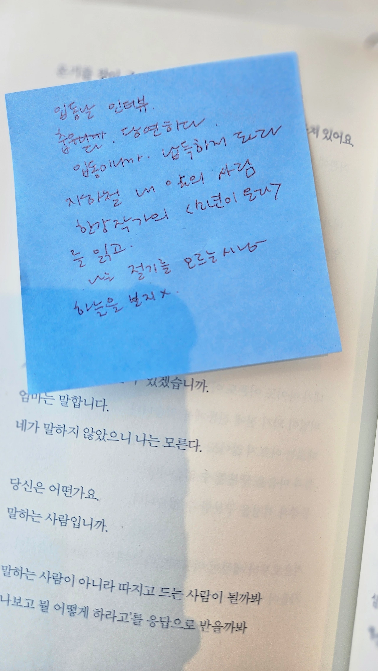 내가 사는 마을에서 약속 장소로 가기 위해서는 광역버스를 타고, 강남역에 내려 다시 2호선을 타야 한다. 강남역에 내리니 12시. 해가 떠 있는데도 바람이 차다. 다행히 지하철 안은 한산하다. 자리를 잡고, 가방에서 책을 꺼낸다. 경험상 인터뷰 직전에는 너무 인터뷰 생각에 골몰하기보다는, 딴짓을 하는 것이 좋다(물론 이는 충분히 인터뷰 준비가 됐을 때의 이야기다).