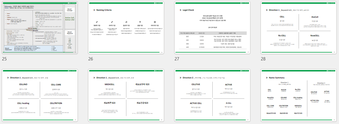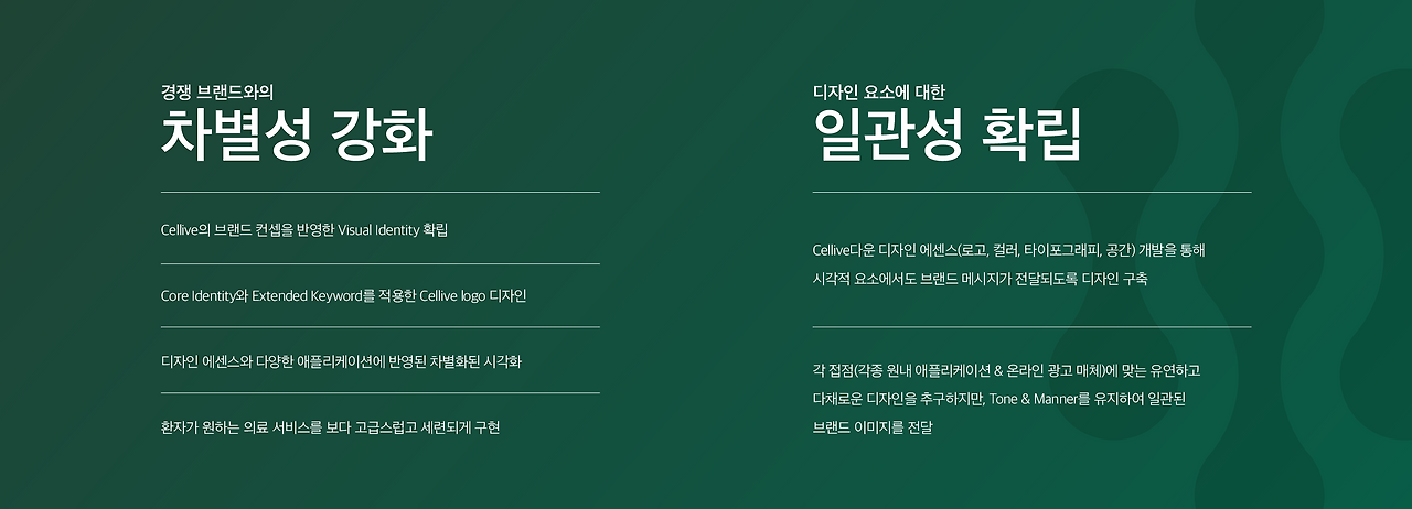 원장님의 강점 (Active)+ 가치관+ 진료철학(cell회복) 등을 통합적으로 담을 수 있는 키 메세지를 좁혀나갔습니다. 혈액순환과 영양공급을 통해 세포 건강을 회복하는 것에 집중하는 내과이므로 일반적인 내과 브랜딩과는 다르게 접근하여 내과의 범주는 넘어 새로운 포지셔닝으로 컨셉을 도출했습니다.