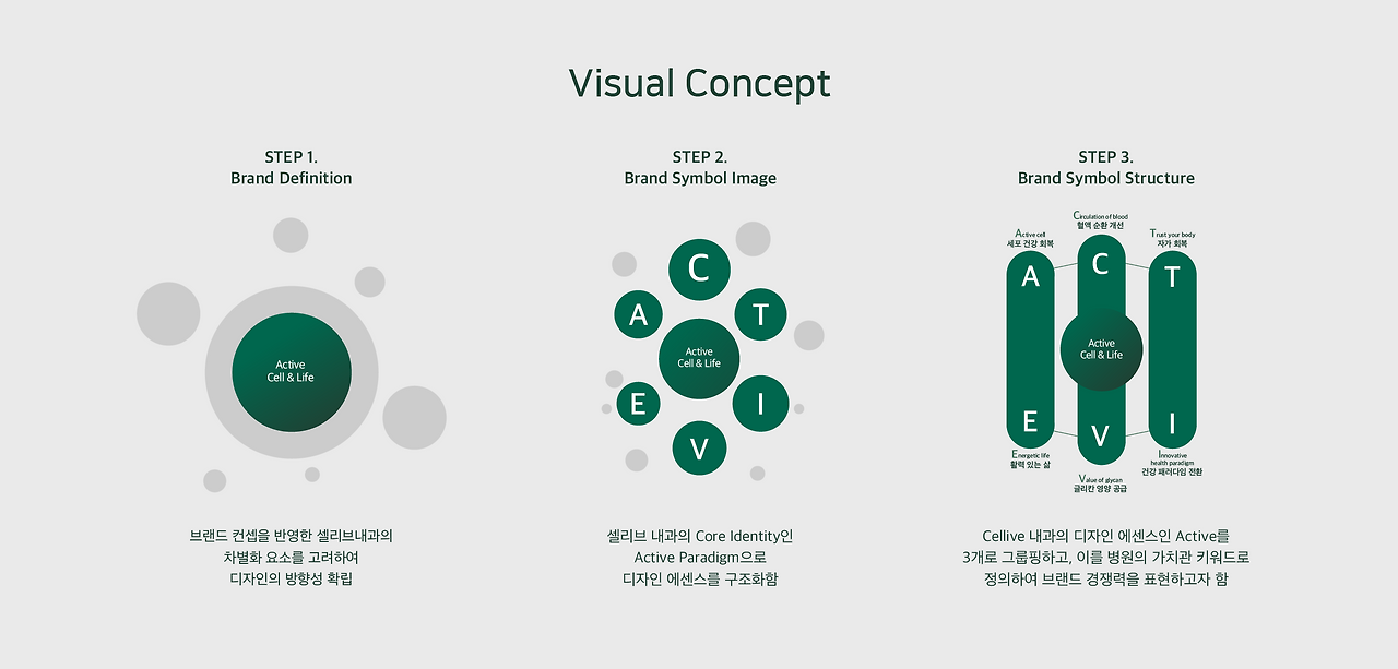 Active라는 에센스의 정의를 다각도로 해석해서 병원의 메세지가 무엇인지 나타내었고, Active cell, Active Life 라는 고객이 얻을 수 있는 삶의 가치를 슬로건화하였습니다.