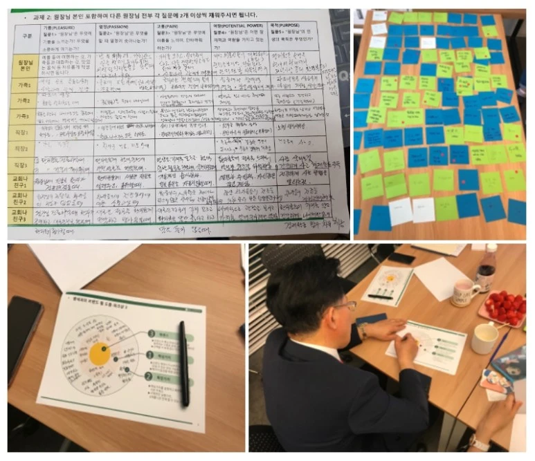 1. 먼저 앤씨의 자기다움 워크북을 통해 원장님과의 브랜드휠 도출 워크샵을 했습니다. 원장님이 이 일을 왜 하는지, 업에 대한 본질적인 탐구는 나다움을 아는 것부터 시작합니다. 도출된 나다움을 기업의 자기다움으로 승화해서 새로운 컨셉이 도출될 수 있게 프로세스를 잡았습니다. 원장님을 잘 아는 가족과 이사님을 포함해서 모두가 열띤 논의와 회의를 통해 원장님의 why를 찾아나갔습니다.